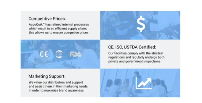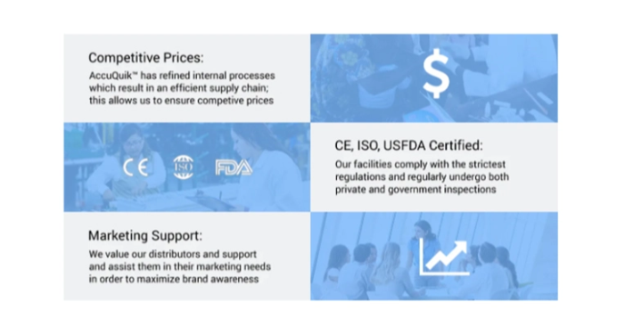 AccuQuik provides high-level, and the three strongest supportive systems are customized promotion, quality packaging design, and strategic support for customers.
