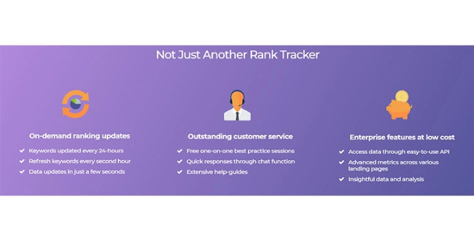 The best thing about Accuranker is that it offers tons of features, all at a low cost, and you can access data through an easy-to-use API. It consists of advanced metrics across various landing pages.
