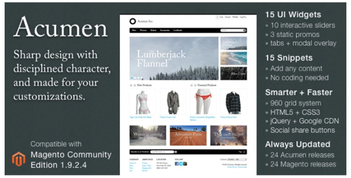 While coming to the Acumen platform's custom features, it creates interactive content sliders with UI widgets. It helps add content areas with snippets into the Magento admin panel, and it provides the 960 grid system. Every template follows column-grids with HTML5 markups. They are scrubbed clean of bulk and infused with semantic powder to enhance the style rewards from modern browsers progressively. Acumen is designed for clarity and systematic organization. It shook up the visual hierarchy to highlight the vital information and removed the clutters replacing it with a beautiful catalog and product pages and streamlines for maximum stability.