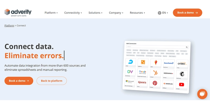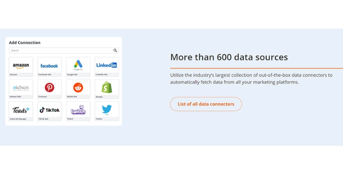 Adversity offers a large amount of connectors to the users. Users can find hundreds of connectors and make the data explore fast and securely. It has a library capable of effortlessly integrating and harmonizing advertising, media, ecommerce, and other marketing data sources.
