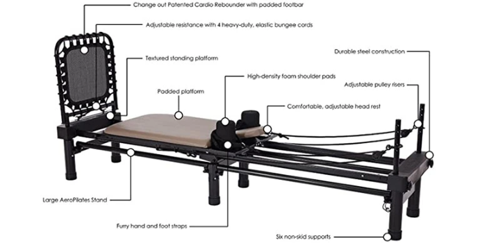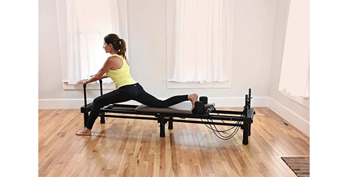 The entry-level cord reformer helps improve the strength and range of motion, fitness, and flexibility. It comes at an affordable price and is equipped with an adjustable headrest, textured, standing platform, and this reformer is padded with high-density foam. Both headrest and footrest are both adjustable and make the experience more comfortable and flexible. The excellent quality aero Pilates comes with a foot bar and spring system that is extremely advantageous to get the resistance that you want to get. You have to take the help of your instructor who helps you to adjust this system to precise the height for you. This spring system of this equipment is responsible for providing resistance. It can be hooked or unhooked from time to time which also helps you to adjust the equipment.