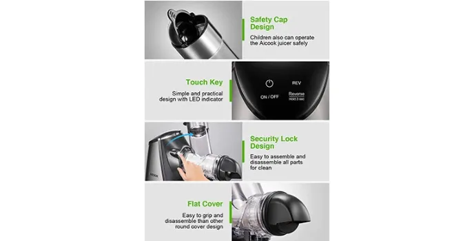 The blades of this Aicook slow juicer rotate at speed less than 80 RPM that effortlessly cut through the vegetables and fruits, thus providing the users with more pulp without building up any heat or froth.