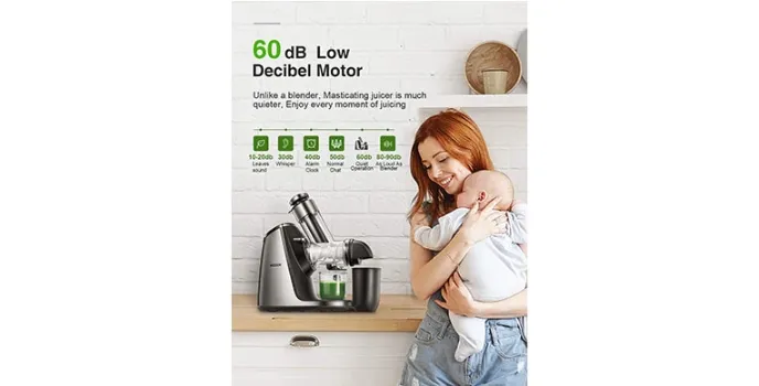 Along with a juicing feature, this premium slow juicer also enables its users to make ice creams. This feature of Aicook slow juicer makes it more unique as compared to Tribest Slow Juicer. With this slow juicer's help, users can easily create not only juices but also ice creams from their favorite fruits. This juicer's performance is powerful compared to Breville Slow Juicer because of its high power motor. Moreover, this juicer's motor produces sound even lower than 60 decibels, making it work smoothly.