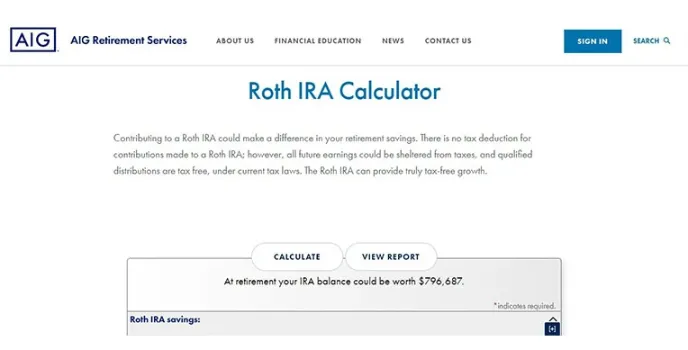 AIG retirement services offer you with different AIG retirement plans that you can purchase in the endeavour to secure your post-retirement financial future. As per the Roth IRA contribution calculator, contributing to a Roth IRA account could bring about a difference in terms of your retirement savings to put it precisely. You can go in for the Roth IRA account which is bound to work as βmy retirement managerβ, for contributions made to the Roth IRA account are free from any kind of tax deductions. Your retirement calculator, as well as your money and investment calculator, might highlight the fact that all your future earnings could be tax-free and even qualified distributions are tax-free as per the current tax laws for the matter.