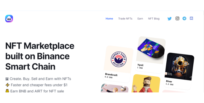 The NFT marketplace is one of the top NFT Launchpads that lets you create, buy, sell, and earn with NFTs and earns AIRT tokens. Your AIRT tokens will enable you to participate in network governance and earn additional token rewards. You can create an NFT by following these simple steps. Connect your wallet to the app, and the BNB balance starts to reflect the balances automatically and instantly. Set a price, or use auctions. And you are set to start earning immediately. Their mission is to support digital artists and the creative industry by empowering them to make magnificent returns from their artworks.