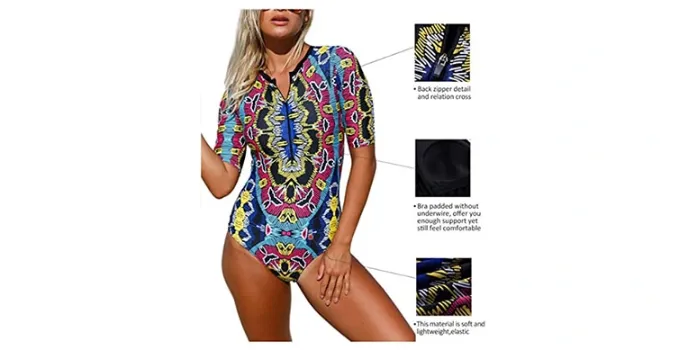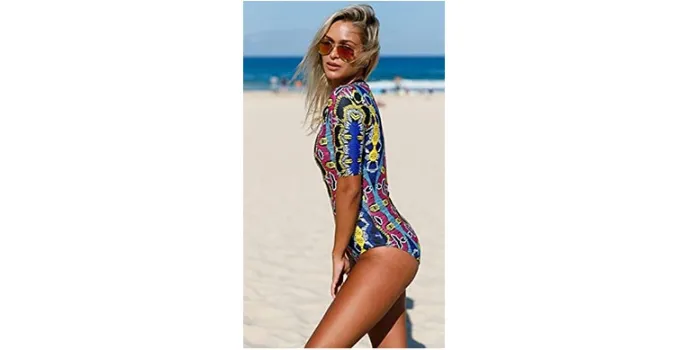It has 82% nylon 18% spandex, an imported material, and a zipper closure. This trendy one-piece suit of symbols comes in a delicate print all over which is attractive in everyone's eye. The product comes in a one-piece suit with a beachwear sexy zip front print short sleeve as it is a summer hot swimsuit bathing suit.
