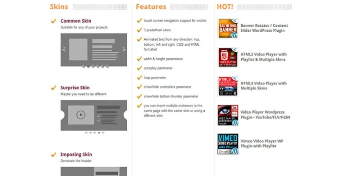 The plugin includes three predefined skins and has 16 photo transition effects. It offers animated text from any direction and is CSS and HTML formatted. There are various width and height parameters to take care of as well, and you can add multiple instances on the same page with the same skin or using a different skin similar to the SEO WordPress Plugin.