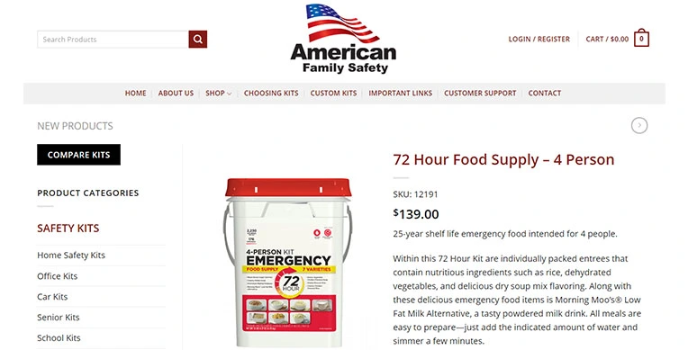 Pack your foods and drinks in high-quality emergency food supply kits from American Family Safety. The 72-hour supply bucket is the most popular one of them, which can serve up to four people. This kit has a twenty-five-year shelf life for emergency situations. It is easy to carry with a sturdy handle, and the food inside is kept safe from dust and toxic particles by a strong lid.