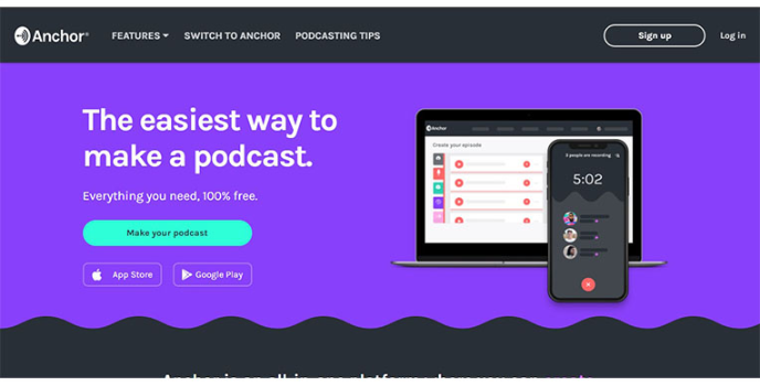 Anchor podcast is a very easy-to-use creation tool that gives you recording opportunities to record and upload and edit any devices with tools that are designed to make you sound great regardless of your skill levels. Anchor also provides 100% free hosting and distribution with no storage limits. It helps you get paid for the podcast while making it available in the United States, and also, it has been aimed to expand soon.