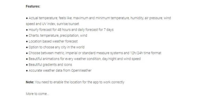 The travel weather app gets you hourly forecasts for the next 48 hours. The hourly estimates include basic weather descriptions, wind speeds, and temperature readings for each hour. It provides a seven-day forecast that provides for the data as mentioned earlier sets from the hourly forecast and barometric pressure, UV index, and humidity levels.