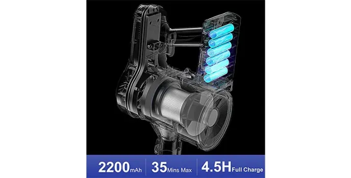 Aposen handheld cordless vacuum cleaner 2200mah 6-cell battery supports 35 minutes long-lasting effect on having a 6x3.7V battery inside support the vacuum with an outstanding good running time of 35 minutes 6KPA and 20 minutes super 10 KPA.