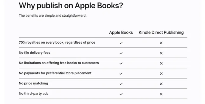 Apple books for authors do not provide any plans to the authors to create, publish and sell their ebooks via the Apple platform. It gives the right to the authors the right to fix a price rate on ebooks. After making sales, it takes 30% of the amount from those sales every month. It doesn't take any hidden prices from authors, so choose this for selling your ebooks.