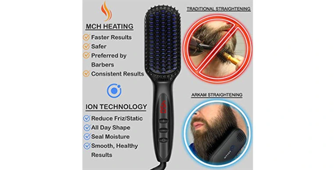 Arkam is one of the best beard straighteners available in the market. It is a portable beard straightener brush for men. This beard brush straightener comes with a premium stealth pocket comb to tame the beard throughout the day. Arkhamโs beard brushes support 110v to 240v, and it works anywhere around the world.
