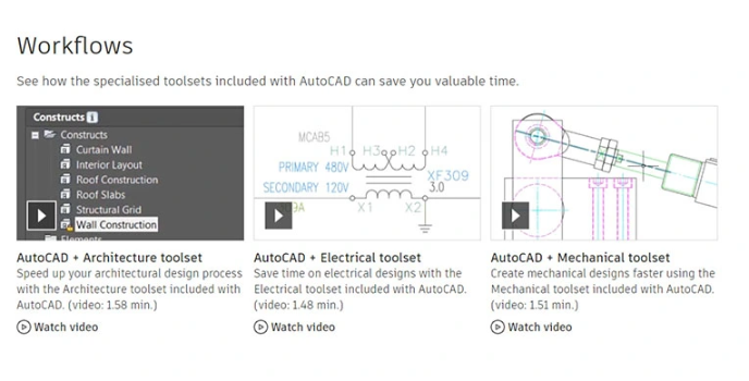 AutoCAD includes industry-specific features and intelligent objects for architecture, mechanical engineering, electrical design, and more. The AutoCAD has a specified toolset for every design plan. Industry-specific toolsets of AutoCAD are Architecture, AutoCAD Electrical, AutoCAD Map 3D, AutoCAD Mechanical, AutoCAD MEP, AutoCAD Plant 3D, and AutoCAD Raster Design, which offer automated floor plans, sections, and elevations.