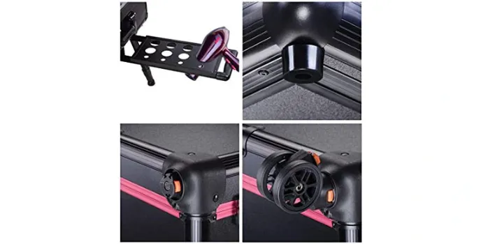 Apart from this, the MDF design keeps the trolley light and keeps the products waterproof and fireproof. Four 360-degree swivels of this traveler promise hassle-free rolling in multiple directions. The full-size mirror is bliss for women to check on their overall look after wearing their favorite attire and makeup on their face. USB port and metal safety locks are unique features of this portable, user-friendly cosmetic traveler luggage. Locking keeps all the products safe and intact without being accessible by kids.