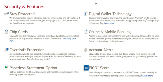 Bank Of America offers high APR on purchases and charges a foreign transaction fee. It requires a larger security deposit than various credit cards. similar to most of the secured credit cards. It also offers several basic features with 0% liability protection that you're not responsible for any unauthorized charges. It also provides the fraud alerts by continuously monitoring your suspicious account activity and sending you alerts for unusual transactions.
