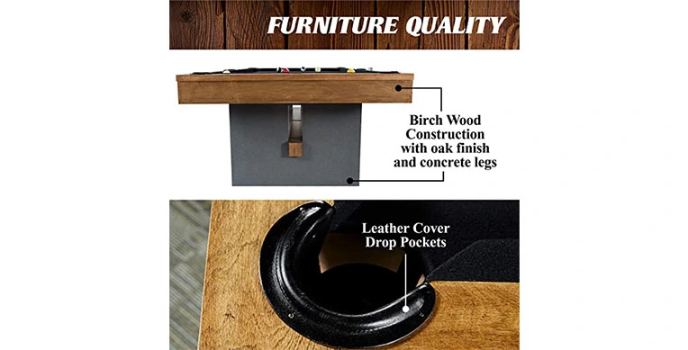 The Barrington Pool Table is a Premium quality durable pool table that is utilized for tournaments too. They are well equipped for competition-grade and come with a 25mm thick surface covered with leather drop pockets and efficiently planked between a birch wood frame. Besides, these table surfaces are supported by concrete-style pillars connected with a wooden rod connector.