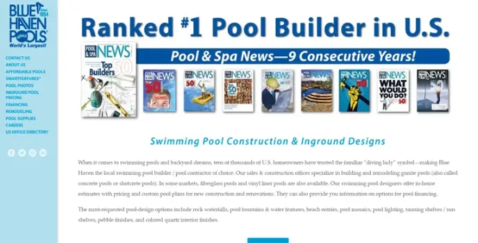 If you are not willing to consider Blue Haven for your backyard pool design, you can go with its two major competitors, California Pool and River Pool, which are known for transforming outdoor living space in elevation and landscapes in a fully automated pool launch area in the new state of the art with valuable insight and have also got Virginia-based fiberglass pool that can make your backyard turn into a cool blue refreshing pool.