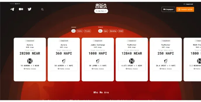 Boca Chica, a premier saas-based IDO Platform, helps capital investors looking for a fundraising solution to move assets between blockchain networks. It was founded in the year 2021. It leverages the power of the Solana blockchain, and its unanimity algorithm helps deliver a unique, frictionless, and safe fundraising avenue for retail and capital investors. Boca Chica uses Solana launchpads to integrate it with the Solana, phantom, and kucoin. Despite other IDO platforms, Boca chica retains a unique quality and comes up with a tokenless structure.