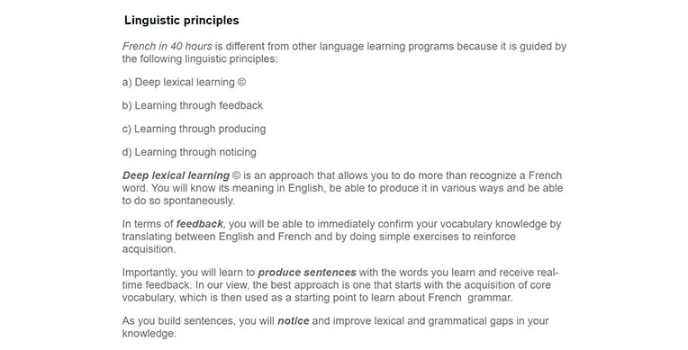 It provides linguistic principles to learn french. Learn through feedback, Learn by producing, and Learn by noticing the principles are Deep lexical learning. It offers simple translation tasks at the end of the tutorial. It is the Best French Grammar Checker.