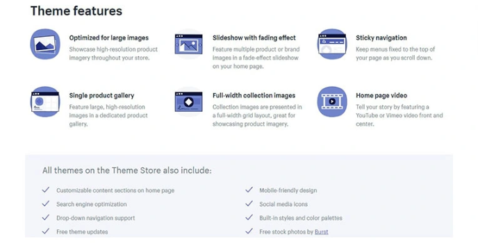 The Shopify Theme is quite great and optimized for large images. It showcases high-resolution product imagery throughout all stores and features multiple products or brand images in a fade-effect sort of slideshow on your home page. The theme comes with a sticky navigation feature and helps with keeping menus fixed to the top of your page as and when you scroll down.