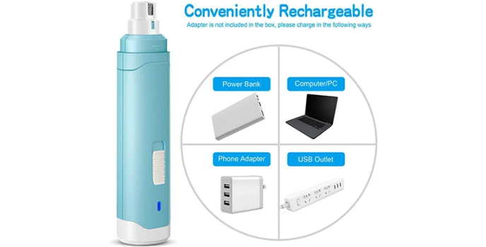 Once you buy this product grinder kit comes with a rechargeable battery, USB cable without an adapter, and user manual. Connect this gender cable to any one of your device's power bank, laptop or phone adapter. Keep charging the battery for 3 hours. That will work for 2 hours. It is one of the best dog claw cares products available.