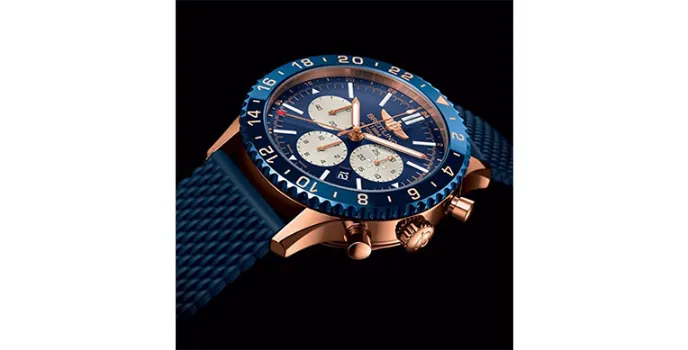 Blue is such a fresh and fantastic color in timepieces. The important thing about choosing this leather watch is that it makes it so suitable for formal and casual wear. It brightens things up. Although it has a simple navigation and control system that enables to adjust the local time by a simple process of pulling the crown out and turning it either way in one-hour increments without losing its precision of minutes and it will automatically adjust the date in either direction, and its red-tipped hands keep track of home in 24-hour mode. It is designed with a scratch-resistant ceramic rotating bezel equipped with an aviation chronograph, and its timeless look displays the third time zone in 24 hours.