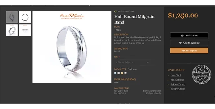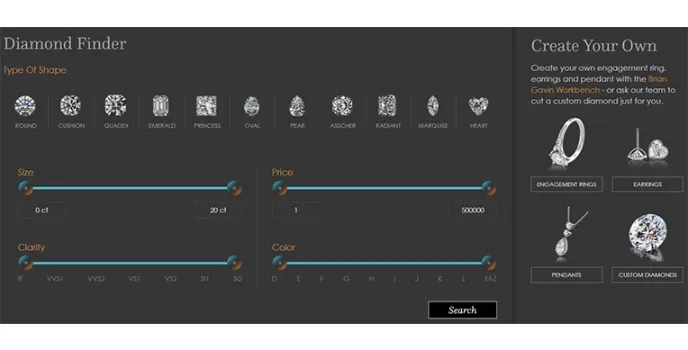 The Brian Gavin Diamond has an integrated diamond finder option, which lets you choose or sort the correct shape, size, price, and color diamond without any hassle. The shape includes cushion, quadex, princess, pearl, oval, etc.