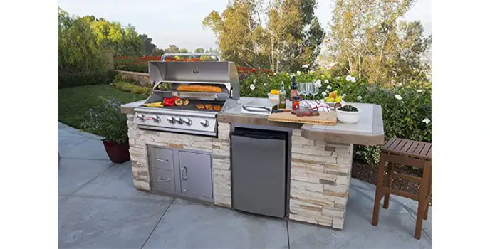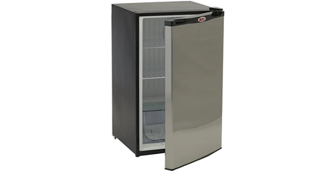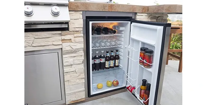 The refrigerator is manufactured with metallic colored stainless steel reversible- right/left swing door, tightly packed flush back design, 60°F to 90°F range of temperature setting. And durable products protect the edible items from anti-fungal diseases, spoilage. This outdoor fridge has 50.6 pounds of weight capacity with two wire racks constructed design makes you stock up condiments on a monthly basis.