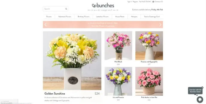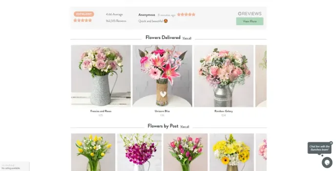 Bunches, a top Flower Delivery Service UK, comes with different flowers like Carnations, Monthly flower gifts, Pink Confetti, Simply Alstroemeria, Spray Cascade, Golden Sunshine, Naiyana, Florist’s Choice Chic, Birthday Cake Gift, and Cherry Blossom. Apart from these flowers, you can get house plants, greeting cards, and hampers for your loved ones on special occasions.
