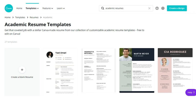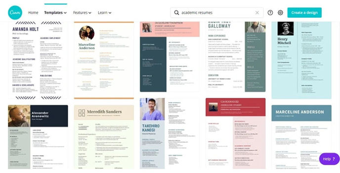 Canva has a straightforward user interface where you can start your app and connect to your inbox, Google, or Facebook profile or register for a new account. Hitting on the start creating button will help to check for an impressive resume template.