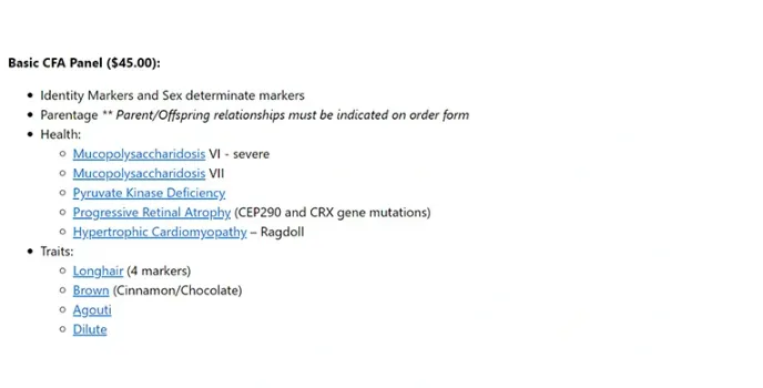 CatDNAtest.org consists of a parentage panel that has a basic CFA panel testing processor. These sections are useful to identify the markers, fingerprints, and unique features of cats.