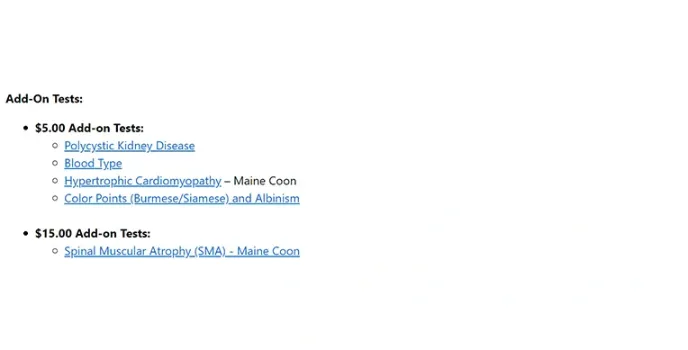 Spinal Muscular Atrophy is one of the advanced Cat DNA tests alongside best Dog DNA Kits with a separate testing method than basic CFA. People can add on another list of services based on their requirements, but each one costs $15. Some of the major Add-on test lists are catted blood type, Kidney diseases, Cordio related diseases, and Spinal Muscular Atrophy.