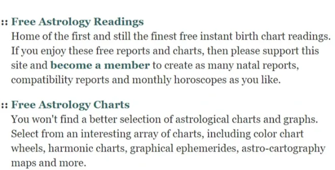 The first and still the best Horoscope Site provides instant birth chart readings can be found here. If you like these free reports and maps, then please support this site and become a member to build as many natal reports, compatibility reports, and monthly horoscopes as you want.