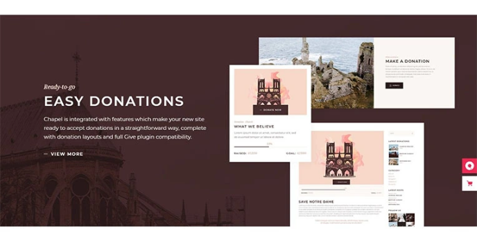 Let's start by making donations. Chapel lets you accept donations with some support from the GiveWP plugin, a ubiquitous donation plugin. GiveWP also supports some customization options so that you can fine-tune the donation experience. The WooCommerce plugin will let you build an online shop right there on your Chapel-themed website if your church wants to sell donated products. One of the best Woo-commerce WordPress themes is the Chapel WordPress theme.