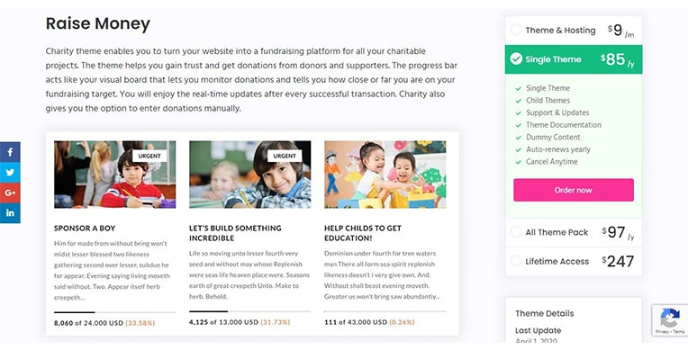 One of the best BuddyPress WordPress themes like Charity WordPress allows creating a theme for donations, fundraising, and supporters for various charitable causes. It even provides real-time updates of donation payments and shows visual boards to check up on the fundraising target.