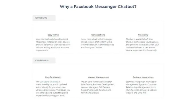 There are a lot of features stored in this Chatbot that will help you accomplish all your requirements. It supports automatic inventory sync to find vehicles, offers text and voice messaging, and supports ADF-XML formatted client email. It has many more advanced features that make it one of the best services for us.