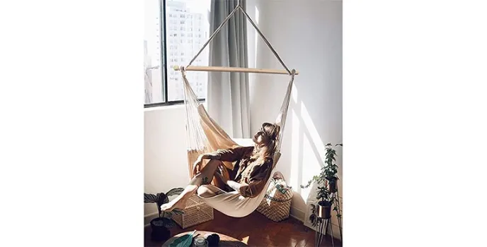 Cotton-polyester blend material construction chairs combine comfort with durability. Its advanced structure is large and designed with 26 cords on the side to hang on the hook, its quick installation suspension point is provided at the top, and it handles up to 330 330pounds or 150kg. This chair could be a great choice than the LazyDaze Chair and Hammock Sky Chair if you are looking for a convenient structure and a colorful design for maximum body relaxation.