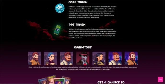 The CORE tokens in these NFT games have a fixed initial mint for supplying tokens. After the initial supply is minted, there won't be any additional COREs. This token represents the entire CipherShooters economy, where players can stake CORE coins to earn TAG tokens. It provides unique game features such as promoting trainees to an Elite operator.