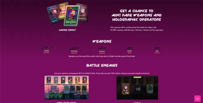 The CipherShooters game allows players to recruit rebellious operators to form a squad and fight against evil corporate bosses that exploit the resources of CipherCity. Through this NFT games platform, players can earn tokens and weaponry for strengthening their army, thus taking back their city from the evil opponents.