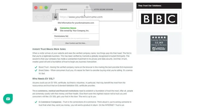 Comodo-a globally recognized & trusted third-party, making them feel that your company has made a substantial investment in its privacy and data security. GoDaddy and Hostinger are other SSL browsers for extended validation. When a visitor visits the website and sees a verified company name, they feel that it is a legitimate site which is crucial to build trust with them and convert them into customers.