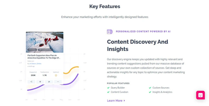 The query builder, custom sources, custom curation, insight, and analytics are for rapid business growth. This marketing tool is accessible with all the platforms such as social media, blogs, newsletters.