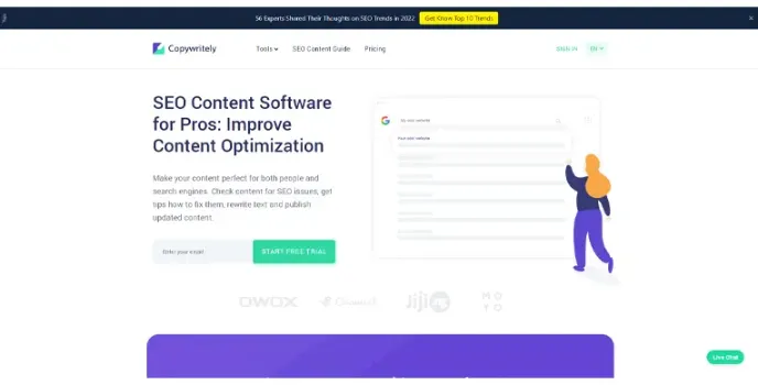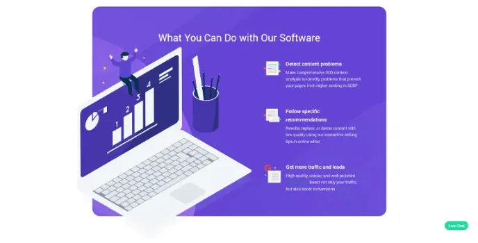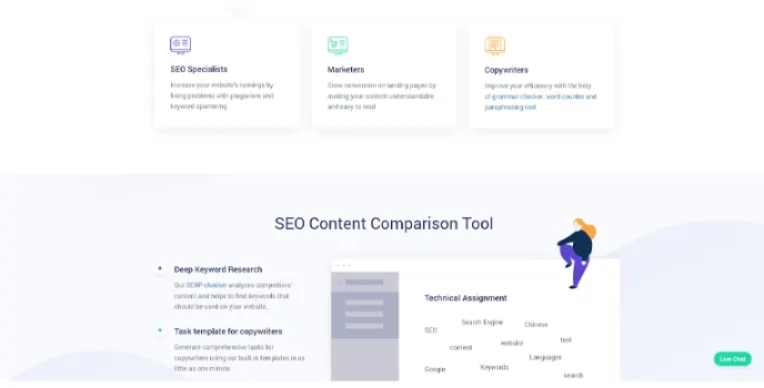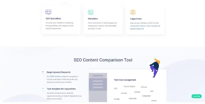 The tool offers high-quality, unique, well-polished SEO content to boost page traffic. Its SERP checker offers keyword research by analyzing competitors' content and helps to get the most suitable keywords for the website. They also work as SEO specialists to help you increase your websiteβs ranking by fixing plagiarism and keyword spamming issues.
