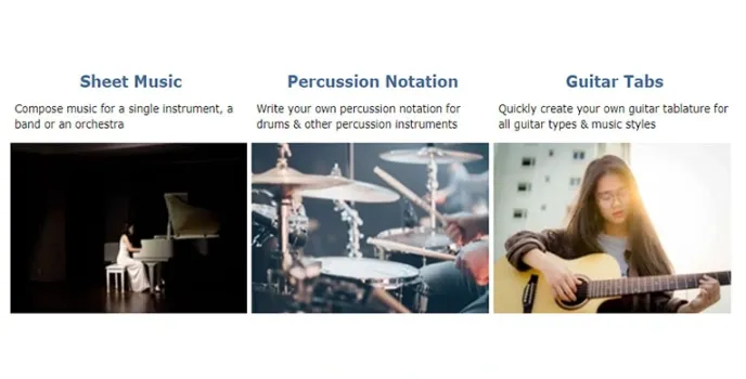 The software makes for an intuitive way to write musical notation or guitar tabs. It includes a variety of music symbols and gives optimum control over creating sheet music for their arrangements. You can easily change the key signature and the time signature and create sheet music in the treble, bass, tenor, or Alto Clefs. You can also write your guitar tablature and create dotted notes, chords, add repeats, and so much more.