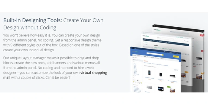 CS-Cart hosts a drag-and-drop user interface for enhanced data organization. Using the exclusive layout editor, users can choose to customize storefronts using multiple themes, backgrounds, color schemes, and fonts.