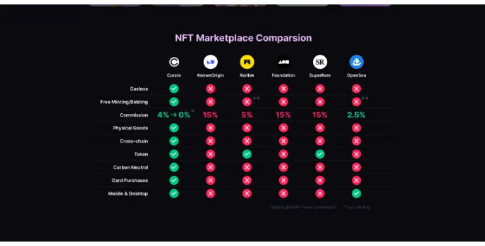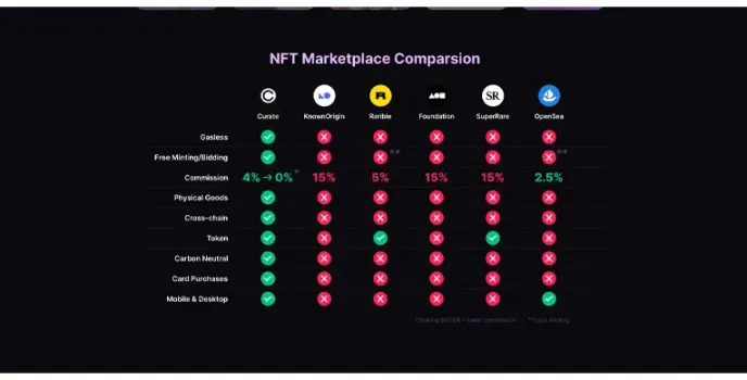 Curate is one of the best fashion NFT marketplace empowering adorable digital NFT goods in various categories for males and females. It is the world's first gasless cross-chain and physical products marketplace application. Curate offers zero percent seller commission, and it is also pretty interesting to know that users can earn 0.5% $XCUR to both seller and receiver.