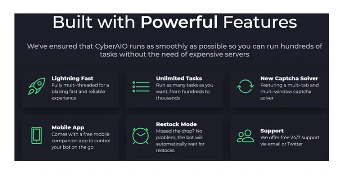 Although the Cyber homepage shopify bot sets £300 for retail cost, it’s actually an OOS bot that can be bought or rented on the aftermarket. Cybersole is arguably the current market leader of All-In-One bots. It supports over 170 sites ranging from Cybersole to Supreme, Footsites, and Mesh sites. And although like other top sneaker bots with updated technologies, it offers excellent customer support, unlimited tasks, and superb UI. Cybersole has a powerful feature that makes it stand out: a free mobile companion app! On which users can create and control tasks, solve Captcha, and track their analytics. Cybersole is also fully multi-threaded to ensure lightning speed. So, its users aren’t obliged to spend time and money renting out expensive servers. Talk about full angle competition!