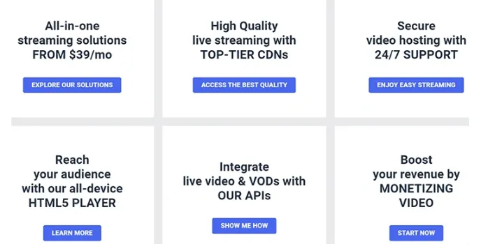 Dacast is a live and on-demand streaming services solution for small and midsize companies that uses a centralized dashboard to broadcast live and on-demand videos and events. The platform will help teams learn more about user engagement, top-performing content, consumption analytics, revenue generation, and location metrics.