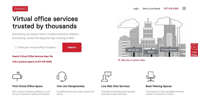 DaVinci is a virtual office service trusted by thousands that provides everything you expect in a current business address. It has various features that may lead to finding an office space, hiring live receptionists, live web chat services, and book meeting spaces. When it comes to finding the office space, it has a prime business addressing to use on your business card than websites.