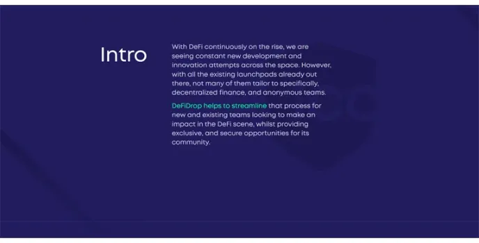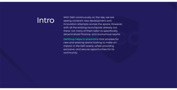 DeFiDrop is a specialized DeFi launchpad and incubator platform tailored to decentralized finance and anonymous teams. DeFiDrop wants to ensure a fair and trustless launch for all; they will be focused on the community and entirely community-funded. Having witnessed numerous unfair and unsecured launches, they want their users' security prioritized.
